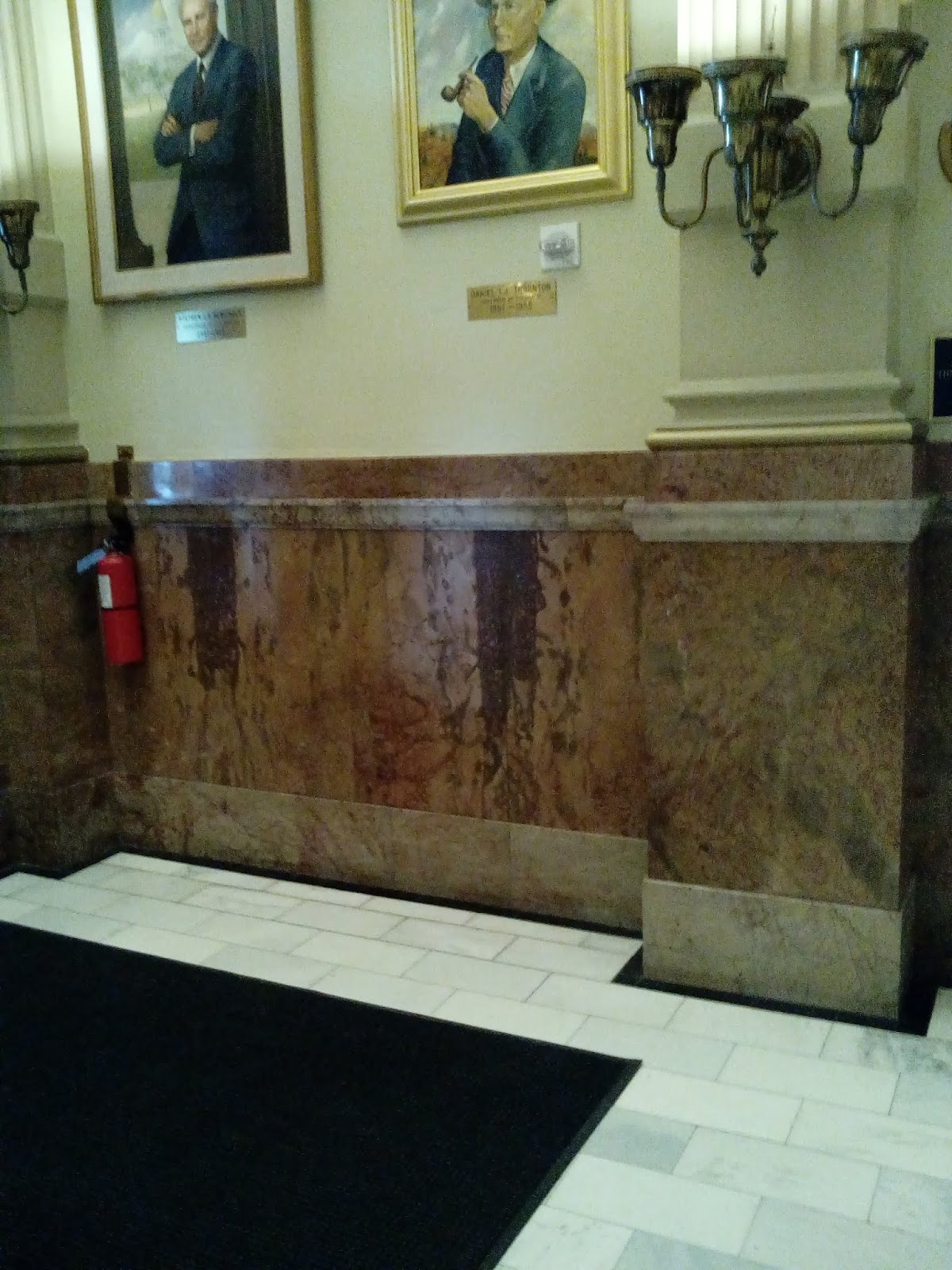 Only the brass (there a four or five people employed in the Capitol just to polish the brass fixtures) and white oak are from other states. The brass is from Cincinnati, Ohio and Louisville, Kentucky, and the oak is from the Ozarks in Arkansas and Missouri.