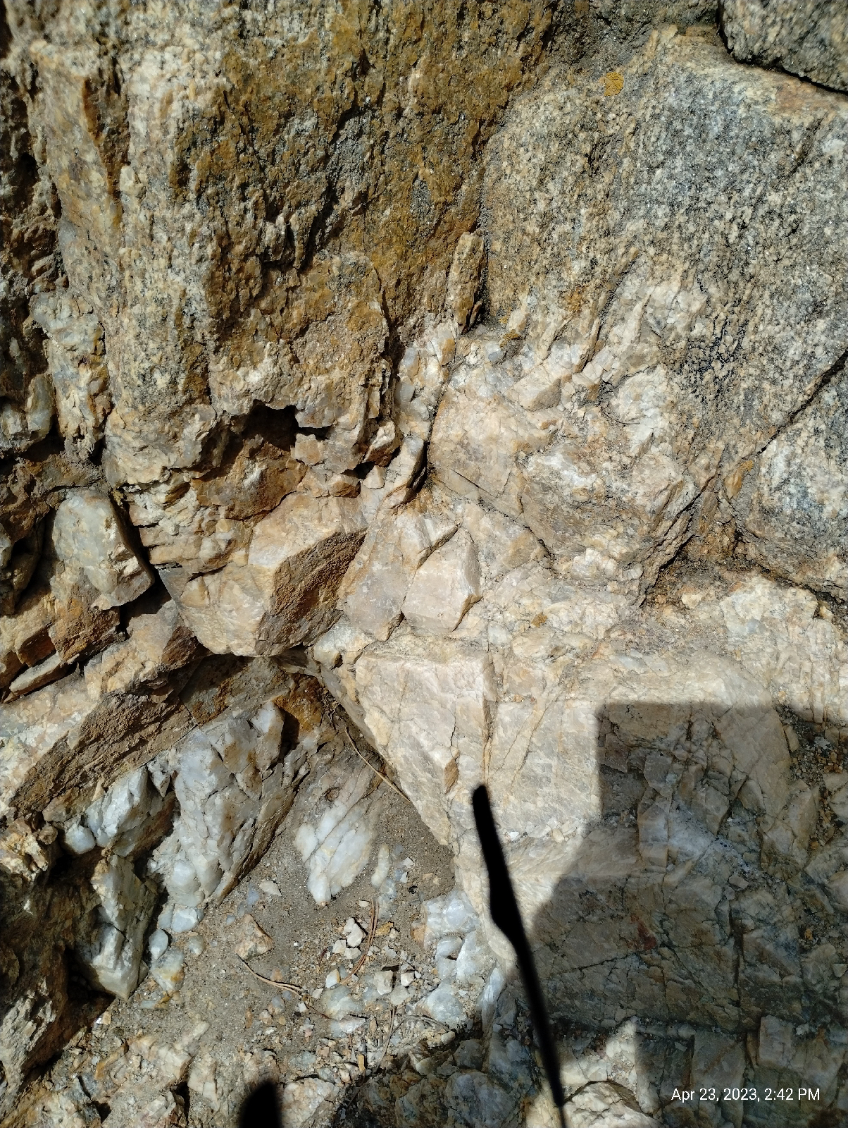 The rocks in Boulder Canyon are crosscut by numerous faults, veins and dikes. The faults are where large bodies of rock have broken and slide against each other.